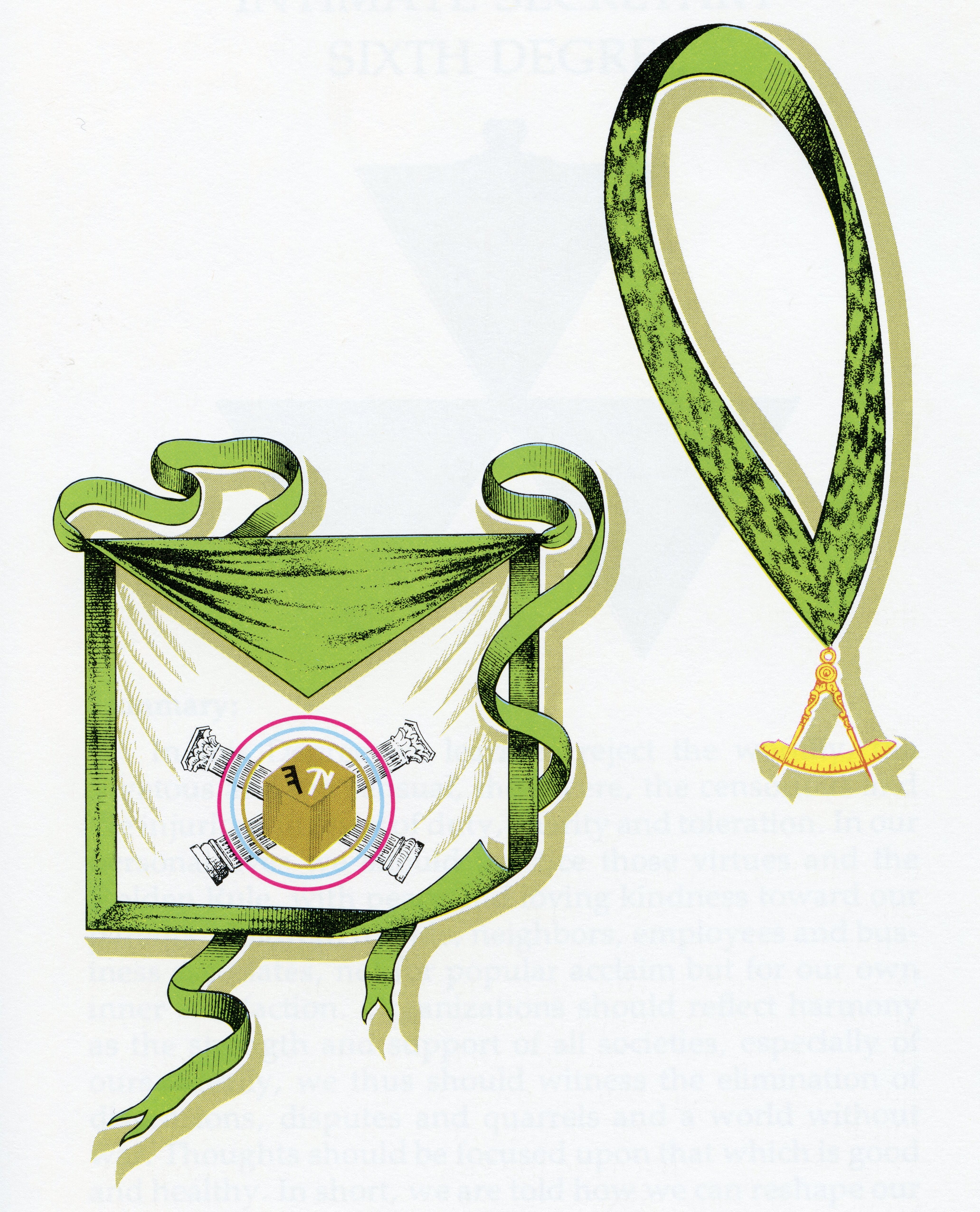 The regalia of the V° contains a cube within circles, backed by crossed pillars. The letters on the cube are